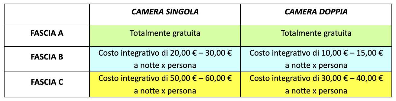 N.B. 2 Gli alloggi di FASCIA A possono trovarsi non nelle vicinanze di Villa dei Cedri e, per gli spostamenti, gli ospiti potranno utilizzare o mezzi propri o il transfert messo a disposizione dal FIS.